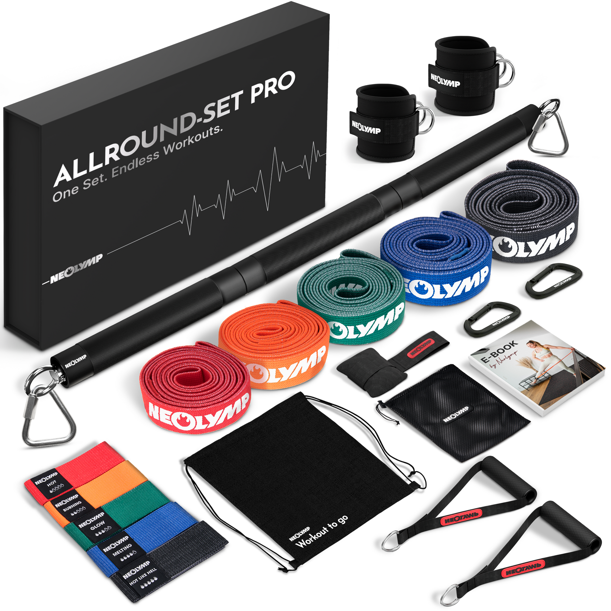 Alles, was du für effektives Trining im Home Gym benötigst: 5 Widerstandsbänder in unterschiedlichen Stufen,2 hochwertige Griffe, 2 Fußsschlaufen und einen Türanker. Zusätzlich legen wir unsere Bänderstange (Curlbar) dazu. Sie hilft die enorm beim Training und sorgt für mehr Kontrolle, Stabilität und Übungsvielfalt, perfekt für kontrollierte Squats, Curls und Rudern wie im Gym.