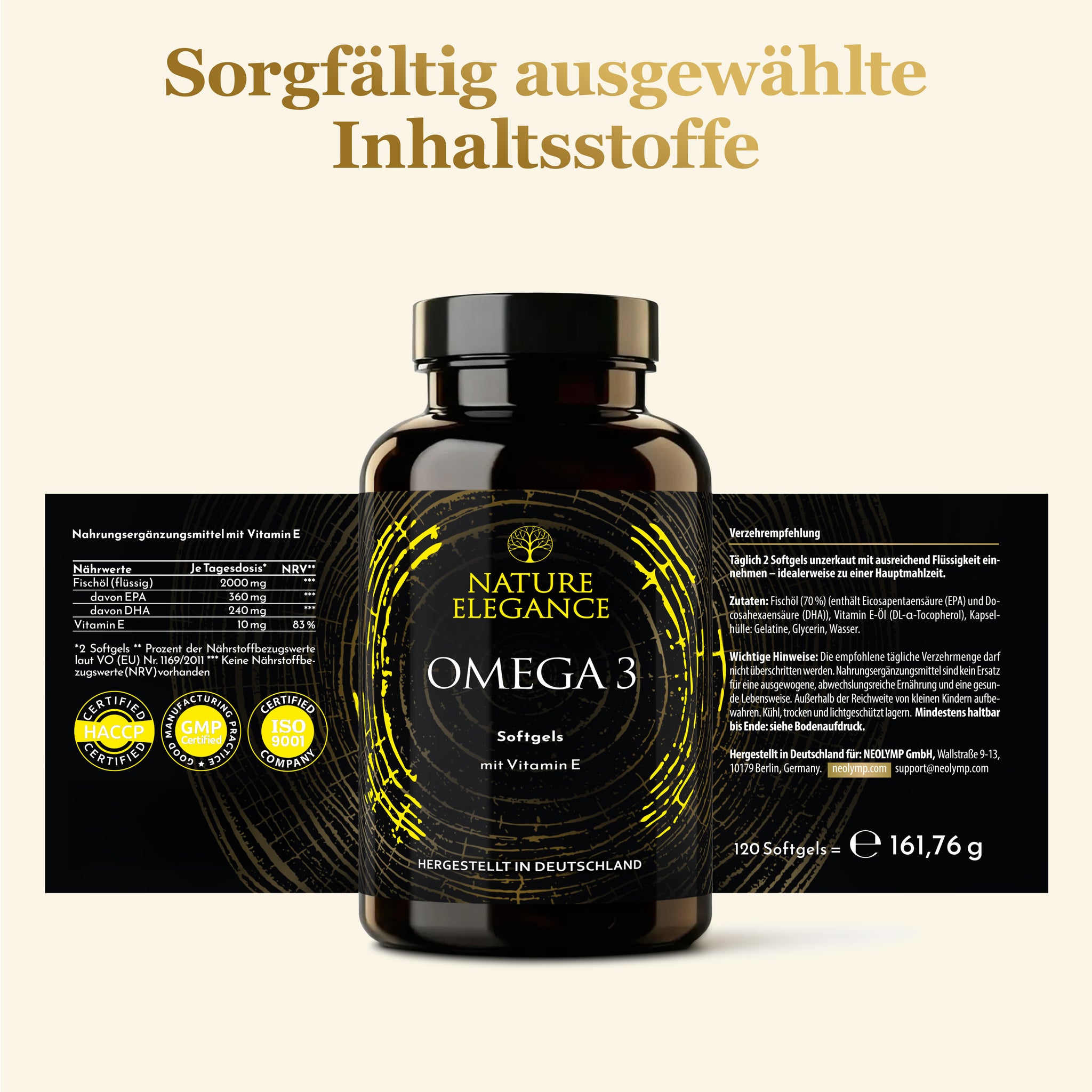 Nature Elegance gehört zur NEOLYMP-Familie und folgt den gleichen hohen Standards in Entwicklung und Herstellung. Unsere in Deutschland produzierten Supplements sind frei von Gentechnik, ohne unnötige, künstliche Zusätze und bewusst sinnvoll dosiert. Die lichtgeschützten Braunglas-Verpackungen helfen, die Qualität der Inhaltsstoffe zu bewahren. Die Zutatenlisten halten wir bewusst schlank. Alles Wesentliche, kein Ballast.