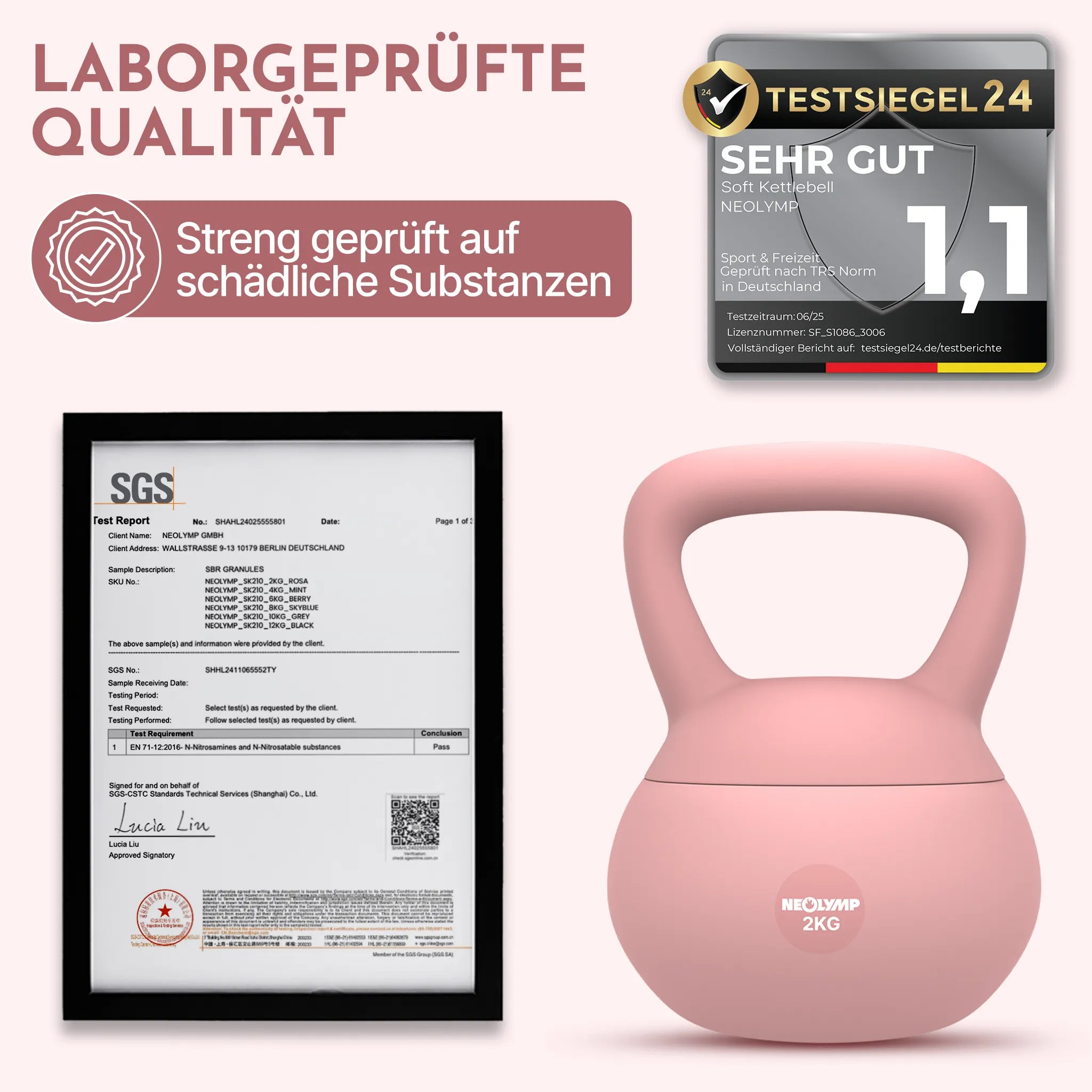 Du bekommst die Soft Kettlebell in 2 kg, 4 kg, 6 kg, 8 kg, 10 kg oder 12 kg, damit du genau die Stufe wählen kannst, die zu deinem Level und deinen Übungen passt. Jede Gewichtsstufe kommt in einer dezenten Farbe, die optisch perfekt zu unserem restlichen Sortiment passt. Das Design ist schlicht und modern, ideal für ein aufgeräumtes, optisch ansprechendes Home Gym. Zusätzlich ist die Qualität laborgeprüft und SGS zertifiziert, streng auf schädliche Substanzen geprüft, damit du mit gutem Gefühl trainieren kannst.