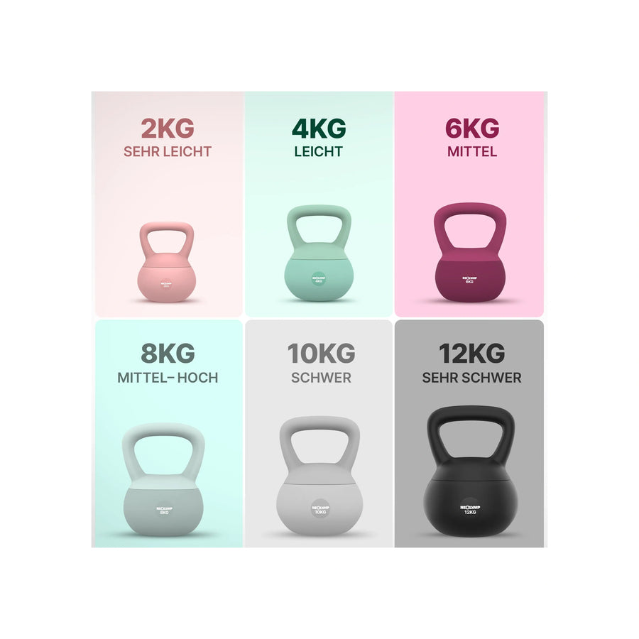 Unsere Soft Kettlebell kombiniert eine weiche, bodenschonende PVC Außenhülle mit einem harten Kern für echte Trainingsreize. Der Softgriff unterstützt dich bei sicherem Halt, auch bei kleinen Händen und schweißtreibenden Workouts. Im Home Gym ist sie angenehmer und meist leiser als klassisches Gusseisen. Du wählst dein Gewicht von 2 bis 12 kg, jede Stufe kommt in einer dezenten Farbe.